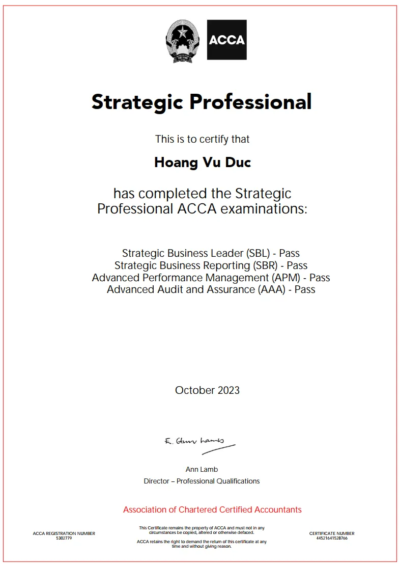 "Mình chọn học ACCA P2 vì muốn củng cố kiến thức chuyên môn để áp dụng vào các quyết định tài chính cấp cao. Khóa học cung cấp góc nhìn chiến lược, giúp mình hiểu rõ hơn về tác động của các chuẩn mực kế toán trong bối cảnh kinh doanh toàn cầu. Một khóa học rất đáng đầu tư cho bất kỳ ai muốn nâng tầm sự nghiệp tài chính!"